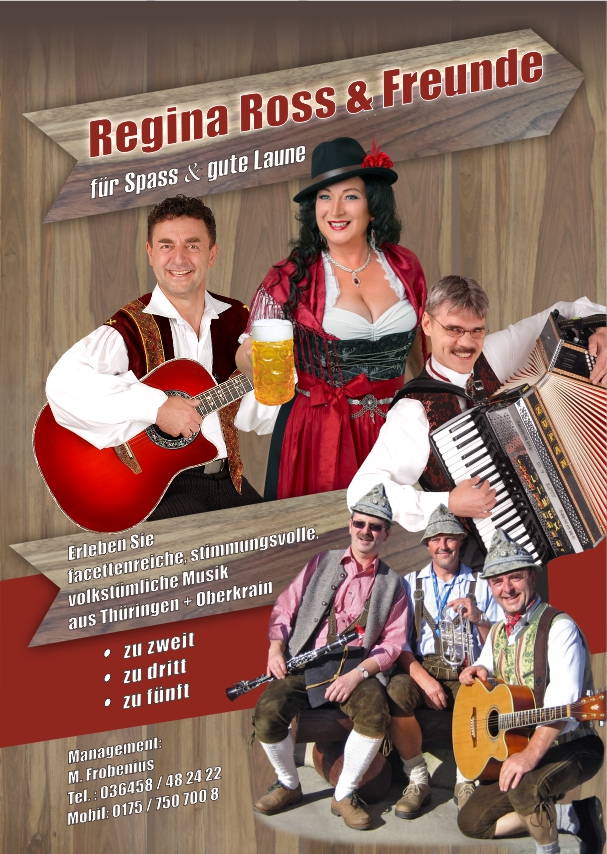 Erleben Sie mit "REGINA ROSS & FREUNDE" facettenreiche volkstümliche Musik aus Thüringen und Oberkrain, Gaudi- und Stimmungsmusik.